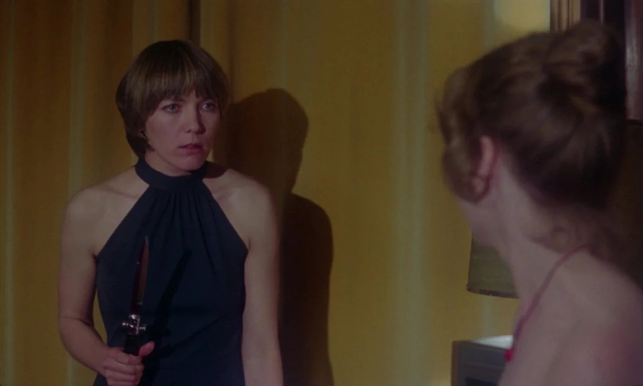 This aspect of Jo’s character is rather interesting, even if it does colour our perception of her character quite negatively. The fact that she is so destructively masculine is constantly contrasted with the fact she is so openly and prevalently misandrist. Right from the beginning of the film to the very denouement, she shows a blatant disregard, dislike and contempt for males. From throwaway lines like “Of all the men, I hate Dave Haggerty the most,” and “No weirder than most men,”, to the rather bizarre and prejudicial “Do you take sugar? Most men do.” This unashamed dislike of men is such that it’s clearly evident when Jo is trying to maintain a sense of alpha masculinity, of being the male figure in control despite her womanhood. Indeed, in the presence of Anders, whom she often considers a threat or an alternative ‘suitor’ to Jessica due to his gender, she goes to extreme lengths to assert her superiority and ‘maleness’ over him. In one of the more notable scenes in the film, Jo has Anders dress in feminine clothing for a celebration, an elegant ensemble of a black dress, heeled shoes and lipstick, to reduce his position as a male and ensure her own superiority in Jessica’s eyes. This does not work however, as Jessica remains fascinated by the stranger, causing Jo to react with jealousy. In a very tense moment, when Jo and Anders are left alone, there’s an awkward silence as Jo stares her rival down and advances on him slowly. With both of them dressed in feminine clothing, it’s almost like a duel to see who will submit and who will dominate. Jo of course tries to get the upper hand, by aggressively forcing herself onto him and trying to kiss him, but Anders steadfastly resists, only adding to Jo’s frustration. It’s also incredibly interesting that in her moments of failure, Jo’s behaviour and demeanour becomes ever more childish and hysterical, screaming at high volume, thrashing her arms and effectively throwing a hissy fit, behaviour much more expected of a dated female stereotype. It’s almost like she reverts to a traditional female role when she is frustrated, unable to keep up the masculine ‘charade’ that she continually employs. In fact, the film has this undertone of mania with regard to her character, portraying her sometimes as a traditional ‘madwoman’. Not only does she indicate that she may be an asylum escapee, but even some of the decor reflects this; shortly after knocking Jessica out, Jo contemplates her situation with two posters in the background. These posters (Le Journal des ventes and La Maison Moderne) are part of a collection known as Artistic Poster Mania, a potent metaphor for the unravelling mania in the house from Jo’s spiralling madness.
